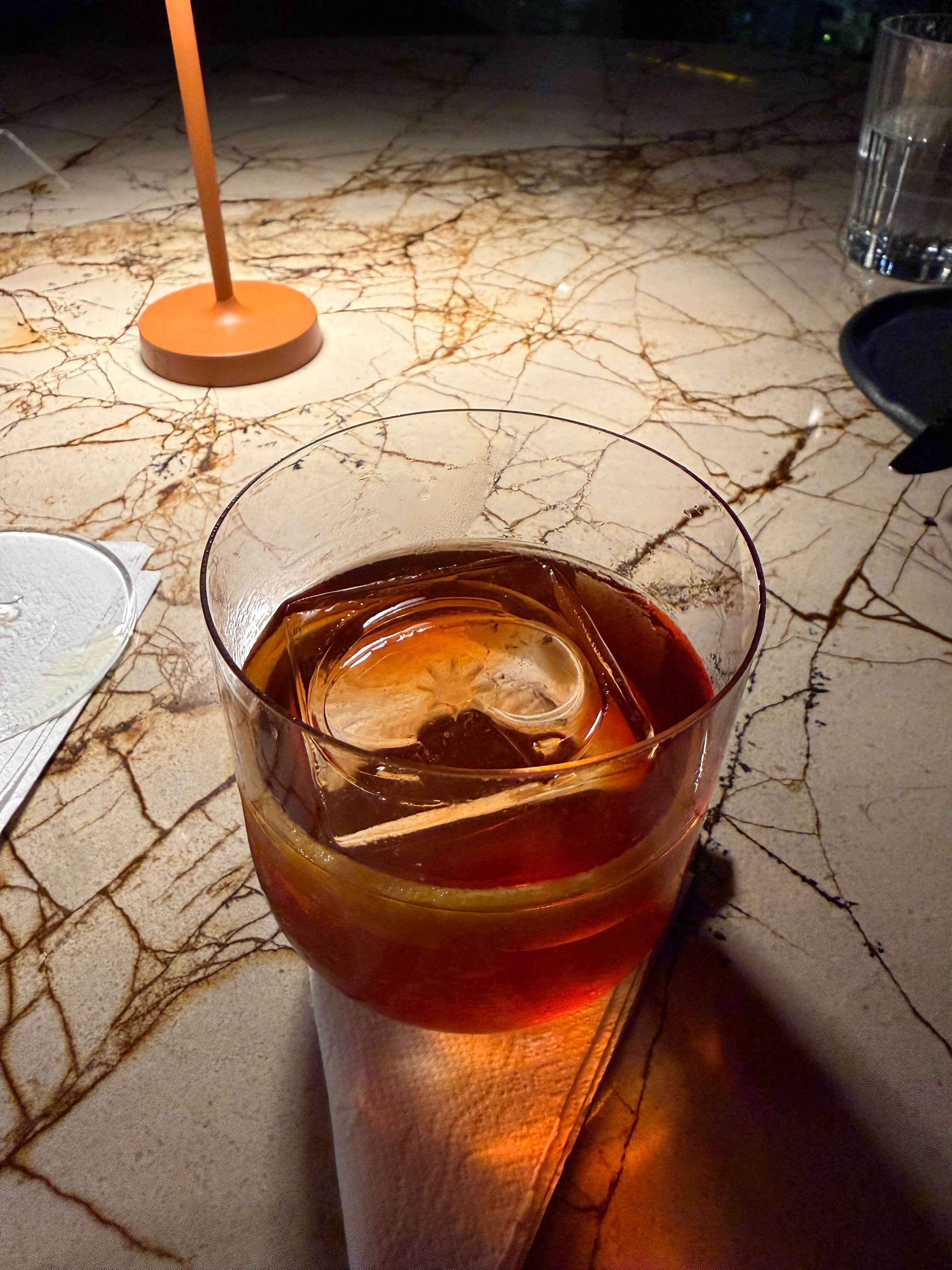 Meu acompanhante ficou comentando sobre o Negroni com um dos garçons durante boa parte da noite. Isso porque a versão do Coreto foi adaptada com ingredientes mineiros, feito com Vermute de Jabuticaba no lugar do tradicional Campari.