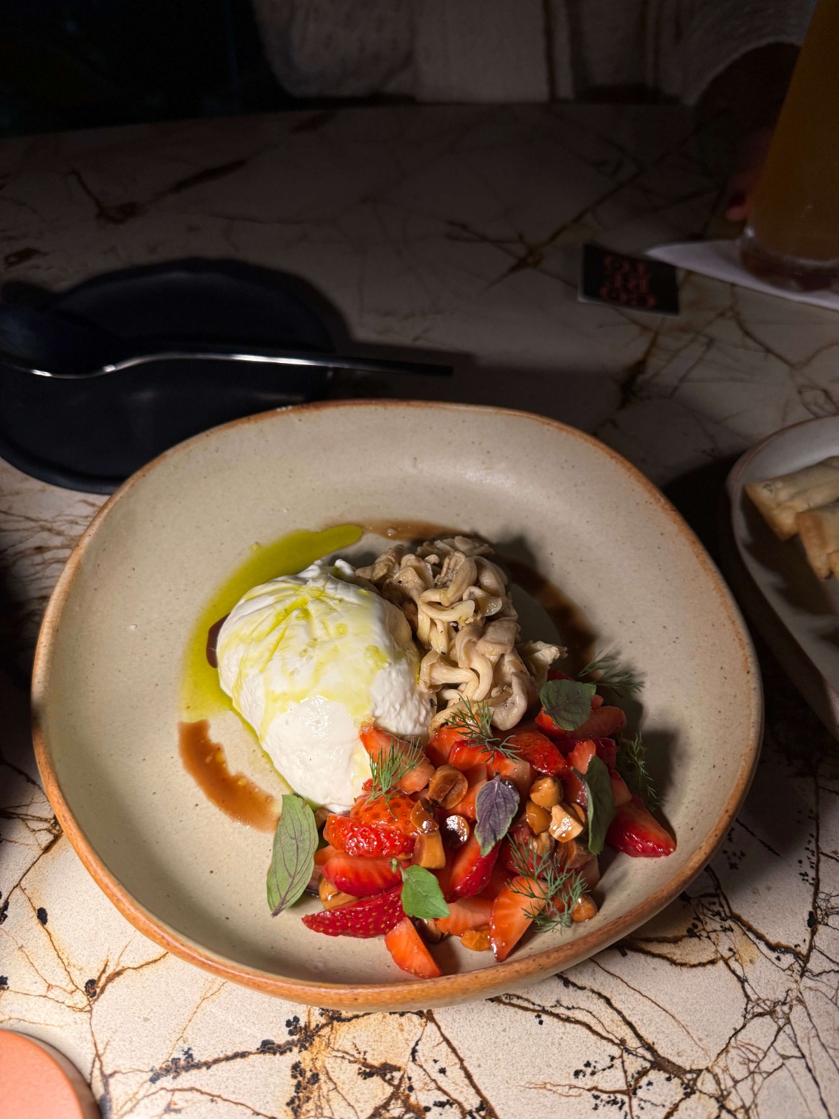 A combinação de burrata com morango e baru parece inusitada, mas os ingredientes se complementam perfeitamente, criando uma explosão de sabores. O pãozinho de fermentação natural vem para acompanhar a mistura.