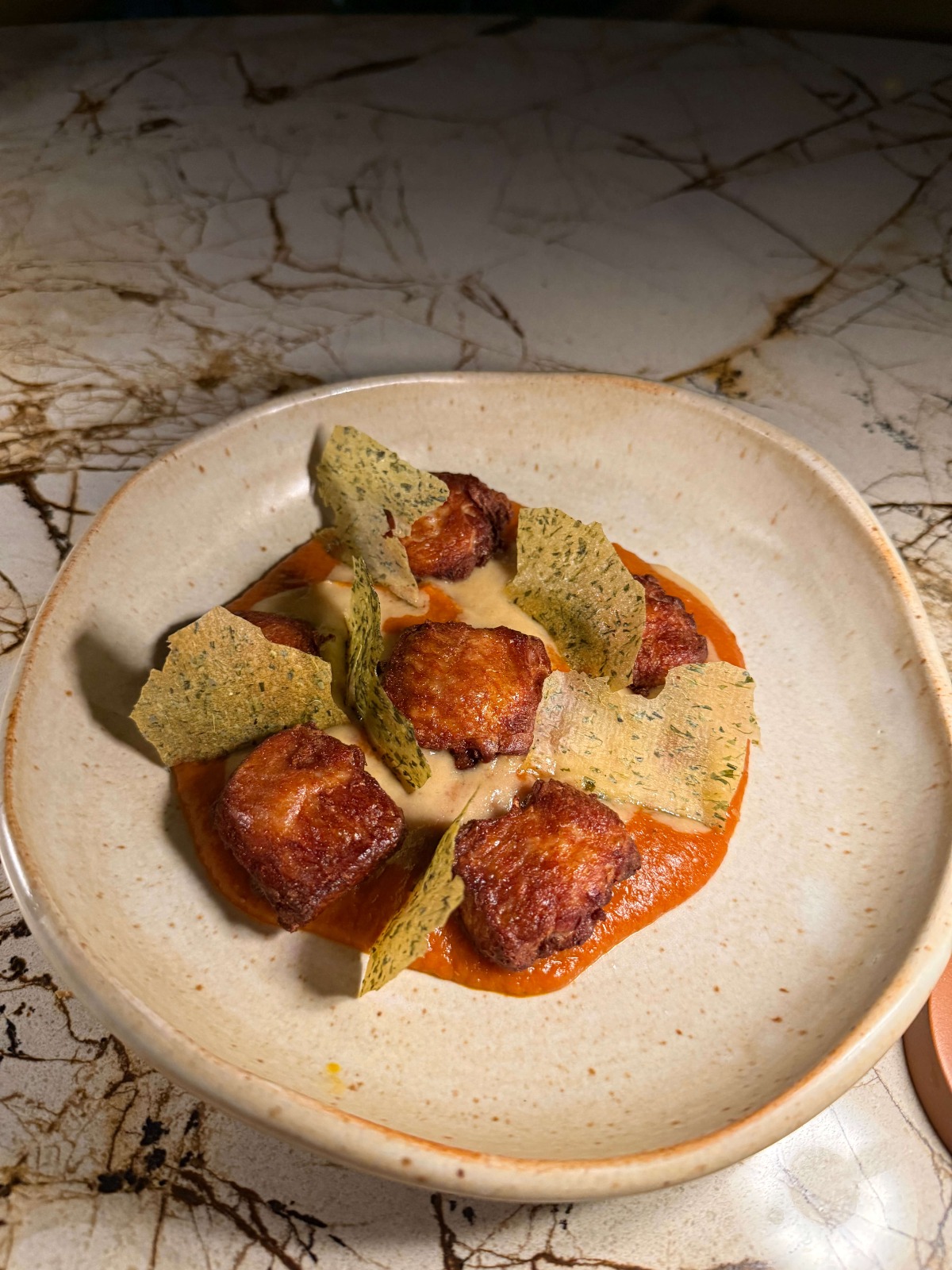 A chef Ana Gabi surpreendeu o nosso paladar com o Peixe, que é um surubim conservado na manteiga com pão de tomate, crocante de tomate e molho ácido de urucum. Seis unidades é pouco para esse prato, rs.